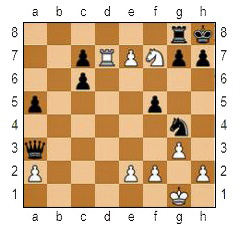 Efter att torn slog damen och flyttat på g8, flyttar nu vit häst på f7 och gör schackmatt. Kungen är kvävd av sina egna pjäser.